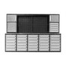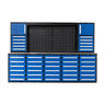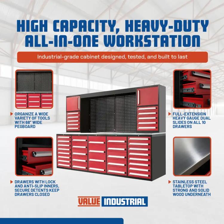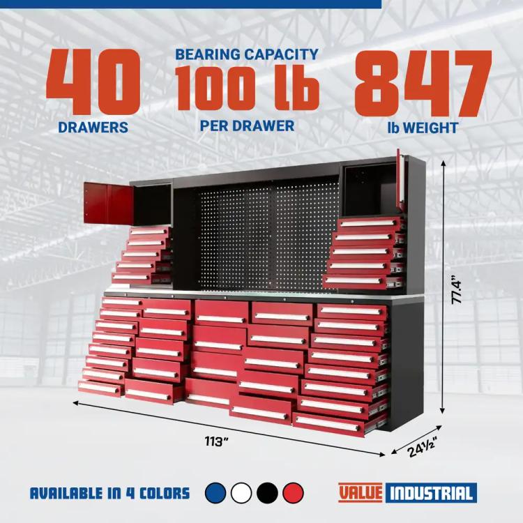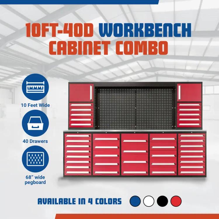 This 10FT-40D-2 is a combo of workbench and cabinet, a Total of 30 drawers on the workbench, and 10 drawers on the cabinet. Two swinging doors on the top Cabinet. There is a great pegboard about 68” wide for tool hanging and other ideal purposes. All the workbench drawers have full extension ball bearing sliders and each drawer’s holding capacity is more than 100lbs. Each 5 workbench drawers come with one lock.