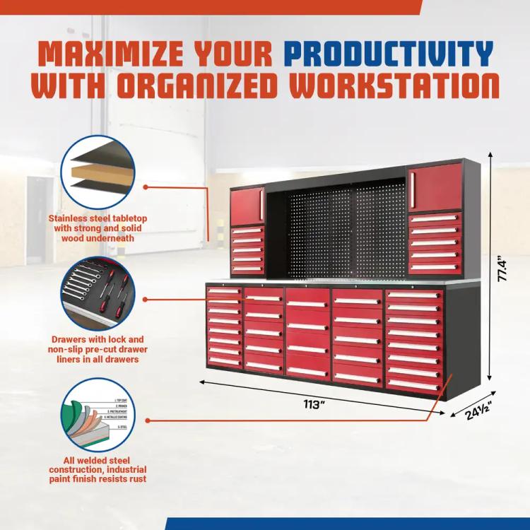 Workbench: 113″ (L) x 27 1/2″(W) x 37 3⁄8″(H) + Cabinet: 40″(H)